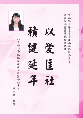 第四屆委員會就職典禮誌慶 香港紅十字會耆英團九龍地區委員會 積健延年 以愛匡社 社會福利署九龍城及油尖旺區福利專員 關淑儀 敬賀 7