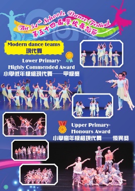 The 54 th Schools Dance Festival 第五十四屆學校舞蹈節 Modern dance teams 現代舞 Lower Primary- Highly Commended Award 小學低年級組現代舞—甲級獎 Upper Primary- Honours Award 小學高年級組現代舞—優異獎 2
