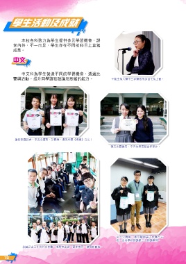 學生活動及成就 ͉ࣧ߅ߧɢމኪ͛Զεʩኪ୦ዚึdሙ ੀʫ̮dʔɓϾԑdኪ͛͵ίʔΝٙ߅ͦɪఃᐏ ϓ؈f 中文 ʕ˖߅މኪ͛ᐄிʔΝٙኪ୦ዚึdீཀˢ ᒄၾݺਗdʺΝኪᛘᄳᛓᑺʿܠၪٙঐɢf 全能主播大賽中三參賽者葉詠茵七情上面。 擔任校園記者,中五李選寶、彭曉琳、湯美玲獲《明報》肯定! 徵文比賽獲獎,中五何樂雯踏出作家夢。 中六余曉嵐、潘惠卿朗誦天份獲得肯 定─香港學校朗誦節二人朗誦奪冠。 校園記者工作坊外出參觀─港島電車遊─實地考察,撰寫新聞稿。 70