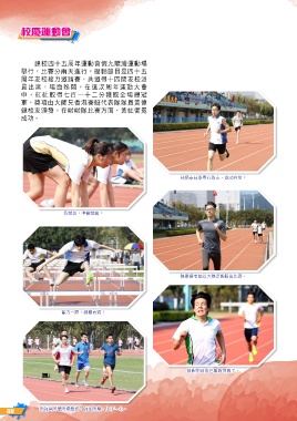 校慶運動會 ܔ̬ࣧɤʞմϋ༶ਗึɘᎲᝄ༶ਗఙ ᑘБdˢᒄʱՇ˂ආБdᏀൿື̬ͦ݊ɤʞ մϋʾࣧટɢᒗሗᒄdᒗɤ̬ගʾࣧݼ ࡰ̈ࢩdఙࠦᆠችfίவϣմϋ༶ਗɽึ ʕdߎٟ՟ɖϵɓɤɚʱᐏ՟Όఙᐼڿ ࠏdᆤධ͟ɽࢪ̃࠰ಥᒄ˾ڌඟඟࡰරਃ ࣧʾ೯fίਢਢඟˢᒄ˙ࠦdරٟ㠛ਐ ϓ̌f 林炳泰同學專心致志,成功在望! 各就位,準備就緒! 陳景揚老師以大熱姿態勝出比賽。 奮力一躍,越欄而過! 領跑的同學已無暇回頭了。 88 老師與同學同場競技,師生同樂,上下一心。