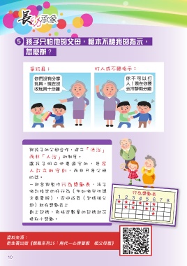 承 5 孩子只怕他的父母,根本不聽我的指示, 怎麼辦? 與孩子的父母合作,建立「法治」 而非「人治」的制度。 讓孩子明白他要遵守的,是 家 人訂立的守則 ,而非只是父母 的話。 一起參與製作行為獎勵表,孩子 做到指定的好行為(例如做完功課 才看電視),家中成員(包括祖父 母)就在獎勵表上 劃上記號,有指定數量的記號就可 換取小獎勵。 資料來源: 衛生署出版《親職系列25:兩代一心齊管教 祖父母篇》 10