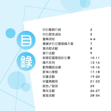 中心職員介紹 2 中心開放通告 3 目 會員須知 4-6 7 傷健步行日暨會員大會 復活節活動 8 推介活動 9 錄 悅書好圖章設計比賽 10-11 晴天系列 12-14 動物輔助治療 15-16 廚神小學院 17-18 兒童活動 19-20 兒童興趣班 21-22 結他/鼓班 23 青年活動 24-27 家庭活動 28-34