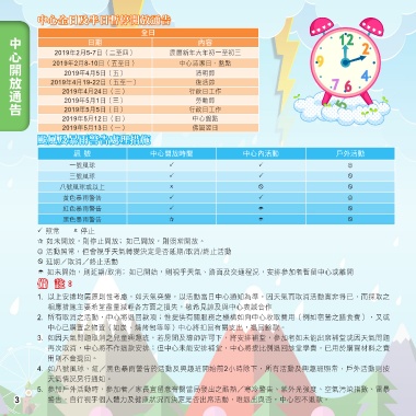 4. 如八號風球、紅/黑色暴雨警告於活動及興趣班開始前2小時除下,所有活動及興趣班照常,戶外活動則按