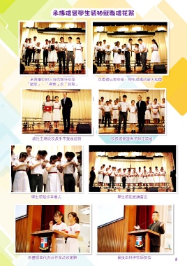 承傳禮暨學生領袖就職禮花絮 承傳禮中的三項信物分別是 承傳禮信物交接,學生組織的薪火相傳 「聖經」、「襟章」及「貝殼」 級社主席從校長手中接過信物 校長頒發證書予卸任領袖 學生領袖扣章儀式 學生領袖宣讀誓言 新舊領袖代表合作演說致謝辭 最後由林津牧師祝禱 5