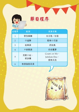 節目程序 ̈ṿҏ ଡ଼й ڌစΤ၈ 1 管弦樂團 生日歌/校歌 2 中國舞 歡樂小花鼓 3 跆拳道 武跆風 4 中詩集誦 依依舊夢 Count on Me、 民歌小組、 5 Jubilate Deo、 歌詠團 韻樂共流 6 教師舞蹈表演