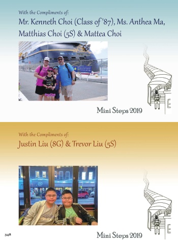 With the Compliments of: Mr. Kenneth Choi (Class of '87), Ms. Anthea Ma, Matthias Choi (5S) & Mattea Choi With the Compliments of: Justin Liu (8G) & Trevor Liu (5S) 348