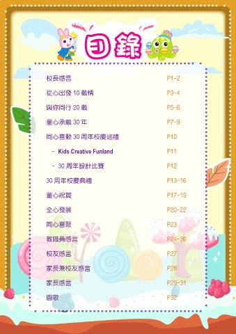 目錄 校長感言 P1-2 從心出發 10 載情 P3-4 與你同行 20 載 P5-6 童心承載 30 年 P7-9 同心喜動 30 周年校慶巡禮 P10 - Kids Creative Funland P11 - 30 周年設計比賽 P12 30 周年校慶典禮 P13-16 童心祝賀 P17-19 全心發展 P20-22 同心喜聚 P23 教職員感言 P24-26 校友感言 P27 家長兼校友感言 P28 家長感言 P29-31 園歌 P32
