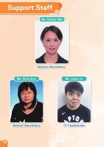 Support Staff Ms. Esther Wat School Secretary Ms. Dora Sun Mr. Jason Li School Secretary IT Technician 14