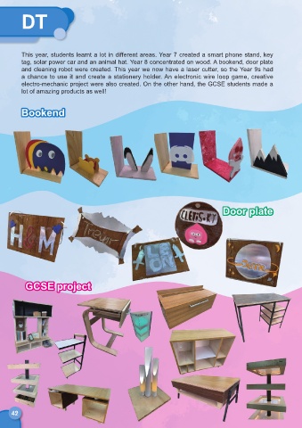 tag, solar power car and an animal hat. Year 8 concentrated on wood. A bookend, door plate