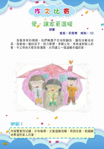 作 文 比 賽 愛,讓家更溫暖 冠軍 姓名:貝思齊 班別:1D Ңฌههձd˼ࡁೌฆʔЇήᚥҢdᜫҢҞᆀήϓ ڗfҢึਂɓࡈλ܀ɿdрɢኪ୦dѽන˨͎dԸڌ༺࿁ɛٙ ฌd˿˨͎ӊ˂ே३࢙တࠦdΝܔͭɓࡈาֱ၅ٙf 評語: ʫ࢙ᔮబϾʲᕚd͵Ϟૢଣf˖അஷනݴd͜൚ܦdঐᇘ ήڌ༺࿁ɛٙฌf 010