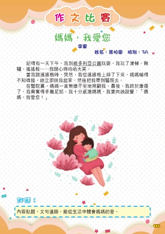 作 文 比 賽 媽媽,我愛您 季軍 姓名:葉柏圖 班別:3A াϞɓ˂ɨʹdҢՑၪεлԭʮِߘdҢِəeᕕ ᜵eศศؐnnҢකː۞۞ɽ३f Ңሸศศؐࣛd߉್dҢศศؐɪદəɨԸdᎽ ʔٝણdμͭуҧҢৎԸd್ܝҪҢ੭Ցᔼ৫̘f ίᔼ৫㛪dɓٜೌฆʔЇήᚥҢf௰ܝdҢੰూ ədҢጳኧ˓ႀԑᒋfҢɤʱชዧdҢࠅΣμႭᑊj dҢฌઆl 評語: ʫ࢙൨ᕚd˖̩ஷනdঐ͛ݺʕึٙฌf 033