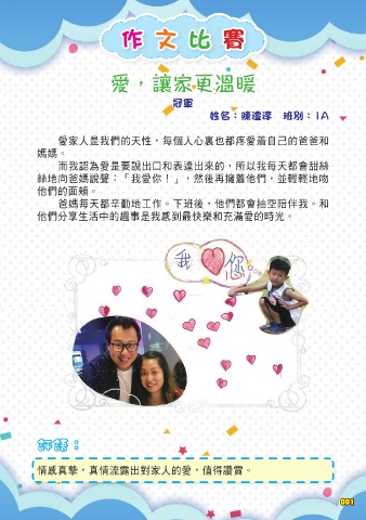 作 文 比 賽 愛,讓家更溫暖 冠軍 姓名:陳澧淳 班別:1A ฌɛ݊Ңࡁٙ˂dӊࡈɛː㛪ɰே़ฌ䋠Іʉٙههձ f ϾҢႩމฌ݊ࠅႭ̈ɹձڌ༺̈Ըٙdה˸Ңӊ˂ேึക കήΣهႭᑊjҢฌЫld್ܝΎኹ䋠˼ࡁdԨჀჀήѕ ˼ࡁٙࠦ᎔f هӊ˂ேԔාήʈЪfɨफܝd˼ࡁேึפ٤МҢfձ ˼ࡁʱԮ͛ݺʕٙሳԫ݊ҢชՑ௰Ҟᆀձ̂တฌٙࣛΈf 評語: ઋชॆᅚdॆઋݴᚣ̈࿁ɛٙฌd࠽ሧf 001
