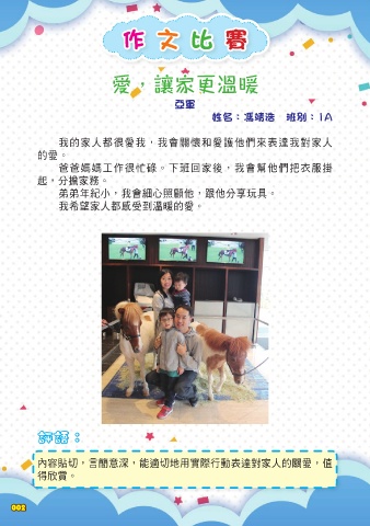 作 文 比 賽 愛,讓家更溫暖 亞軍 姓名:馮靖浩 班別:1A ҢٙɛேܘฌҢdҢึᗫᕿձฌᚐ˼ࡁԸڌ༺Ң࿁ɛ ٙฌf ههʈЪܘώຣfɨफΫܝdҢึᏍ˼ࡁҪВન ৎdʱዄਕf ҔҔϋߏʃdҢึːᚥ˼d༧˼ʱԮِՈf ҢҎૐɛேชաՑาٙฌf 評語: ʫ࢙൨ʲdԊᔊจଉdঐቇʲή͜ྼყБਗڌ༺࿁ɛٙᗫฌd࠽ ؚሧf 002
