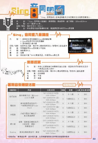 內 容 : 「Sing」音同盟入會講座、樂器體驗、樂器課程、義工樂隊、出Band出Show