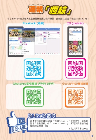 連繫 連繫 「恆綜」 中心有不同平台方便大家掌握最新資訊並保持聯繫,記得讚好/追蹤「恆綜/cyshnit」呀! Facebook (恆綜) IG (cyshnit) WhatsApp即時查詢 (5599 6893) Google Map查詢路線 即Like即賞你 於暑假完結前讚好/追蹤「恆綜/cyshnit」,並於其中一個貼文 留言「我愛恆綜」或「I Like CYSHNIT」,即可到四樓接待處 領取神秘禮物一份#。 # 每人只可參加一次 6