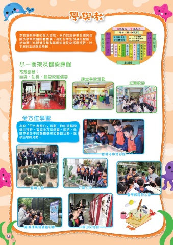 學與教 本校重視學生的全人發展,我們認為學生的德育發 展及學業成績同樣重要。為配合學生的身心發展、 培育學生有穩健的學科基礎知識及能拓展視野,以 下是校本課程的規劃: 小一銜接及體驗課程 常規訓練: 坐姿、站姿、檢查校服儀容 課堂學習活動 遊覽校園 全方位學習 本校「戶外學習日」活動,目的是擴闊 學生視野,實踐全方位學習。同時,學 校亦參加不同機構舉辦的參觀活動,讓 學生增廣見聞。 香港海事博物館 香港公園 九龍公園 香港動植物公園 嘉道理農場暨植物園 屏山文物徑 3