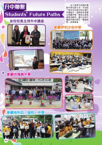 升中聯繫 ᜕ʕኪࣧ͛ݺd͉ࣧৰ މəᜫኪ͛Ⴉᗆձ əᐏʾࣧࣧڗՑࣧ˴ᑺʺ Students’ Future Paths ʕᑺࢭ̮dᒔतήτરኪ ͛ਞᝈʕኪfኪ͛ίਞၾ ሙੀݺਗࣛdᒔ̙˸ձʺ 友校校長主持升中講座 ᛘ༈ʕኪٙኪڗeኪ֎ ၳdՉᆀፄፄf 參觀伊利沙伯中學 ชᑽฌˊژ৵೮ਿږʕኪࣧڗʿϡੈᄃਓࣧڗ ชᑽ֜ͭྗ༸ଣᐌɻʕኪГɘᎲૐᒳࣧڗ 參觀玫瑰崗中學 參觀地利亞(協和)中學 132