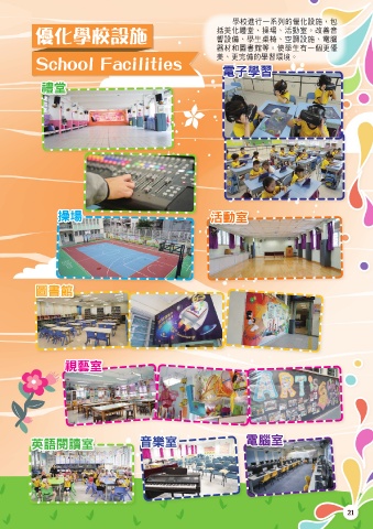 ኪࣧආБɓӻΐٙᎴʷண݄d̍ 優化學校設施 ܼߕʷᓿੀeఙeݺਗ܃fҷഛࠪ ᚤண௪eኪࣲ͛ಉe٤ሜண݄eཥ໘ ኜҿձྡࣣഃfԴኪ͛ϞɓࡈһᎴ School Facilities ߕeһҁ௪ٙኪ୦ᐑྤf 電子學習 禮堂 操場 活動室 圖書館 視藝室 英語閱讀室 音樂室 電腦室 21