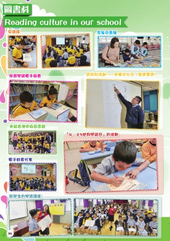 圖書科 Reading culture in our school 早讀課 家長日書展 學習閱讀電子圖書 跨學科活動—中華文化日(圖書雙週) 參觀香港中央圖書館 「4.23世界閱讀日」的活動 電子好書分享 給學生的閱讀講座 86