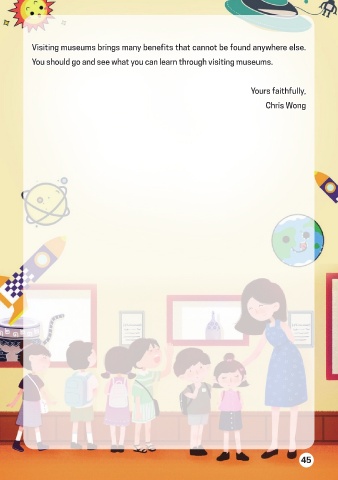 Visiting museums brings many benefits that cannot be found anywhere else. You should go and see what you can learn through visiting museums. Yours faithfully, Chris Wong 45