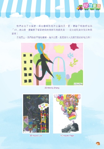 學生薈萃 我們走出了水族館,乘坐纜車到海洋公園的另一面,體驗了刺激好玩的 「VR」過山車,還觀看了精彩絕倫的海豚和海獅表演……這次遊玩真令我回味無 窮啊! 日落西山,我們依依不捨地離開。海洋公園,真是個令人流連忘返的好地方啊! 2D Kimmy Zhang 2E Kaylee Lee 1C Hayden Ngai 83