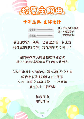 校慶主題曲 十年恩典 主伴童行 詞:校友吳慶良家長 曲:梁嘉盈老師、 方凱寧老師 舊日遠方那一隅角 是無邊漆黑一片荒野 藉着主恩將福澤降 讓晨曦揭開思源一切 園內有四季花與運動場作息欣賞 牆上有祢那詩篇伴童行如像沿路賜光 在各班中遇上良朋像你 師長導引從沒言棄 給我授予道理知識如白石變玉 在這一刻回望前事日記 一切是美 兼有着主十載恩典 陪我度過 陪我度過 2