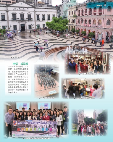 Macau 47  歐華利像 四信 馬遠孜 大三巴牌坊已超過二百年 歷史,是歷史悠久的建築 物。後面還存放為傳福音 而犧牲自己生命的宣教士  與培正中學的學生交流 骸骨,他們很多來自日 本,不懂當地的語言,但 仍然努力為著信仰而來到 這個中華大地。今天澳門 的教會繼續完成主耶穌的 大使命,可見他們的努力 沒有白費。  中華文化館內的展品  培正中學內的中華文化館  議事亭前地  澳門基督教會信心堂的黎牧師接待我們