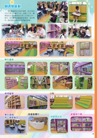 圖書館新貌 學校圖書館自1998年建館,直至2005 年進行第二次翻新工程。相隔十三年,圖 書館於2018年暑假進行第三次裝修工程, 煥然一新的圖書館繼續散發書香,讓同學 在一個舒適的環境中享受閱讀的樂趣。 全新面貌的圖書館 學生書架 教師書架 台階 學生桌椅, 借還書櫃位 新書推介角 令上課更集中 報紙雜誌架 19