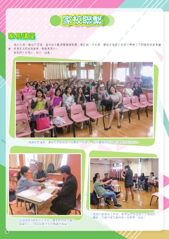 家校聯系繫 家校聯 家長講座 為人父母一點也不容易,當中的辛酸是需要被聆聽,被接納。本年度,學校分為高小及初小舉辦了不同類型的家長講 座,希望多方面支持家長,與家長同行。 家長們十分用心、投入、認真。 透過家長講座,讓家長們學習如何培養孩子同理心,從而讓增加孩子們的親和力及社交力。 透過六節家長工作坊,讓家長們學習與子女溝通的 鑰匙,互相分享互相扶持。家長們!加油! 透過家長4節家作工作坊,讓家長們學習親子 遊戲技巧,學習回應子女的情緒的需要。 20