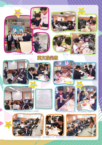 P6 P5 老師帶領學生進行探究活動。 你一言,我一語,奧數多奇妙! 英文拔尖班 P4 P5 同學用心地寫講稿及練習中央廣播。 快快樂樂一起製造布偶,為布偶劇做好準備。 P6 同學留心聆聽老師講解,並把重點記下來,對將要出版的刊物寄以厚望! 7