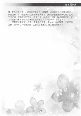 青苗創作集 事,有時候明知道上司有些決定是錯的,但礙於上司的面子也只能唯命是從, 保持沉默。你可能會覺得我懦弱,但「聽話」無疑是在充滿鬥爭的辦公室的 生存之道,若事事據理力爭,力陳己見,相信在不久後,我必會陣亡在一堆 上司有意刁難苦差中或是淹沒在流言蜚語及人事鬥爭中,苦不堪言。 沉默在於我而言,不是一種懦弱的表現,是人生必修的哲學,只有保持 沉默,運用得宜,恰得其份,沉默絕對是緩解人與人衝突的關鍵。 107