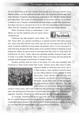 judgment. Therefore, Facebook can affect people’s life and mindsets negatively.