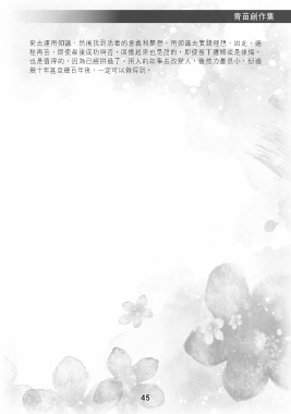 青苗創作集 來去運用知識,然後找到活着的意義和夢想,用知識去實踐理想,因此,過 程再苦,即使最後成功與否,回憶起來也是甜的,即使留下遺憾或是後悔, 也是值得的,因為已經拼過了。用人的故事去改變人,雖然力量很小,但過 幾十年甚至幾百年後,一定可以做得到。 45