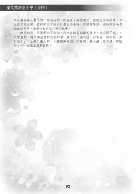 梁文燕紀念中學(沙田) 所以道家能心性平淡,崇尚自然,因此有了無為而治,也因此沒有紛爭。目 光放長遠些吧!當你明白了自己什麼也不是時,你就會發現,現時的紛爭是 如此的可笑,全是沒有自知之明的結果。 總括而言,紛爭源自不自知,我走在追求知曉的路上,追求那「道」, 追求自然,從而希望世界沒有紛爭!老子曰「道可道,非常道,名可名,非 恆名!」「上觀九重天闕,下探幽冥深淵,知萬物,曉天識,成大道,解紛 爭」 這是至理名言啊! 92