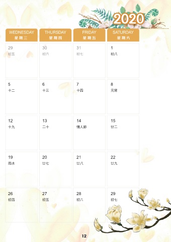 2020 星 期日 星期 一 星 期二 星 期三 星期 四 星 期五 星 期六 26 27 28 29 30 31 1 初二 初三 初四 初五 初六 初七 初八 2 3 4 5 6 7 8 初九 初十 立春 十二 十三 十四 元宵 9 10 11 12 13 14 15 十六 十七 十八 十九 二十 情人節 廿二 16 17 18 19 20 21 22 廿三 廿四 廿五 雨水 廿七 廿八 廿九 23 24 25 26 27 28 29 二月 初二 初三 初四 初五 初六 初七 12