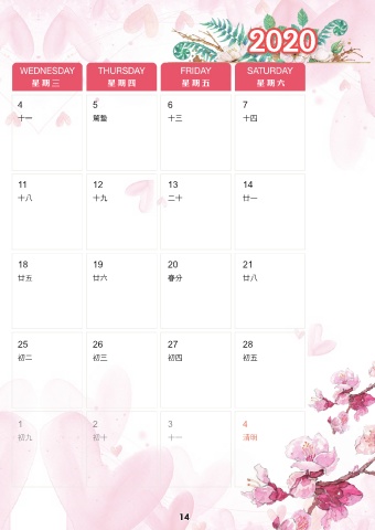 2020 星 期日 星期 一 星 期二 星 期三 星期 四 星 期五 星 期六 1 2 3 4 5 6 7 初八 初九 初十 十一 驚蟄 十三 十四 8 9 10 11 12 13 14 十五 十六 十七 十八 十九 二十 廿一 15 16 17 18 19 20 21 廿二 廿三 廿四 廿五 廿六 春分 廿八 22 23 24 25 26 27 28 廿九 三十 三月 初二 初三 初四 初五 29 30 31 1 2 3 4 初六 初七 初八 初九 初十 十一 清明 14
