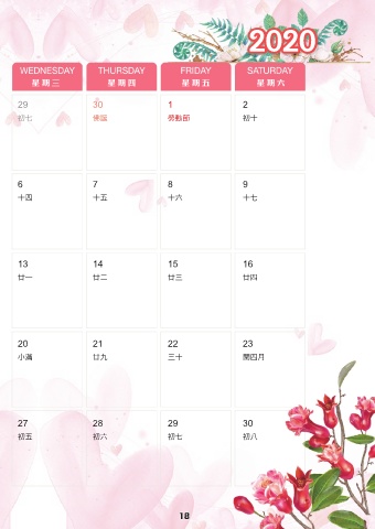 2020 星 期日 星期 一 星 期二 星 期三 星期 四 星 期五 星 期六 26 27 28 29 30 1 2 初四 初五 初六 初七 佛誕 勞動節 初十 3 4 5 6 7 8 9 十一 十二 立夏 十四 十五 十六 十七 10 11 12 13 14 15 16 母親節 十九 二十 廿一 廿二 廿三 廿四 17 18 19 20 21 22 23 廿五 廿六 廿七 小滿 廿九 三十 閏四月 24 25 26 27 28 29 30 初二 初三 初四 初五 初六 初七 初八 18