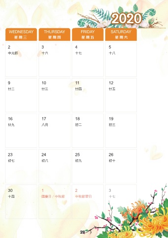 2020 星 期日 星期 一 星 期二 星 期三 星期 四 星 期五 星 期六 30 31 1 2 3 4 5 十二 十三 十四 中元節 十六 十七 十八 6 7 8 9 10 11 12 十九 白露 廿一 廿二 廿三 廿四 廿五 13 14 15 16 17 18 19 廿六 廿七 廿八 廿九 八月 初二 初三 20 21 22 23 24 25 26 初四 初五 秋分 初七 初八 初九 初十 27 28 29 30 1 2 3 十一 十二 十三 十四 國慶日∕中秋節 中秋節翌日 十七 26