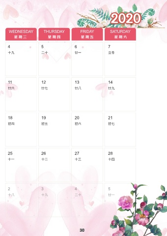 2020 星 期日 星期 一 星 期二 星 期三 星期 四 星 期五 星 期六 1 2 3 4 5 6 7 十六 十七 十八 十九 二十 廿一 立冬 8 9 10 11 12 13 14 廿三 廿四 廿五 廿六 廿七 廿八 廿九 15 16 17 18 19 20 21 十月 初二 初三 初四 初五 初六 初七 22 23 24 25 26 27 28 小雪 初九 初十 十一 十二 十三 十四 29 30 1 2 3 4 5 十五 十六 十七 十八 十九 二十 廿一 30