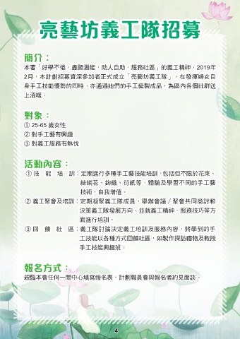 2月,本計劃招募資深參加者正式成立「亮藝坊義工隊」。在發揮婦女自