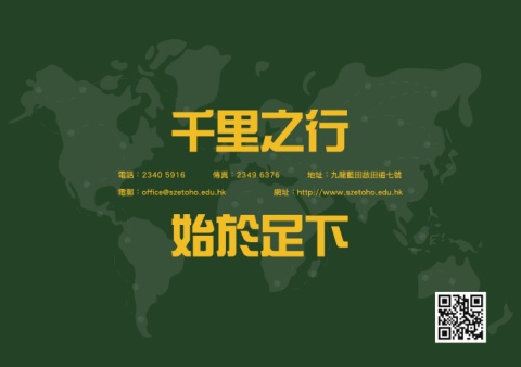 千里之行 電話:2340 5916 傳真:2349 6376 地址:九龍藍田啟田道七號 電郵:office@szetoho.edu.hk 網址:http://www.szetoho.edu.hk 始於足下