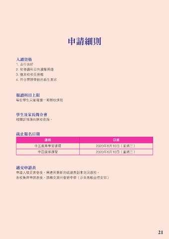 申請細則 入讀資格 1. 品行良好 2. 對修讀科目有濃厚興趣 3. 獲原校校長推薦 4. 符合開辦學校的收生要求 報讀科目上限 每位學生只能報讀一項聯校課程 學生及家長簡介會 相關詳情請向原校查詢。 截止報名日期 課程 日期 中五應用學習課程 2020年6月10日(星期三) 中四選修課程 2020年6月10日(星期三) 遞交申請表 申請人填妥表格後,需連同最新的成績表副本交回原校。 各校集齊申請表後,請轉交潮州會館中學(沙田馬鞍山恒安邨) 21