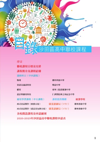 目 目 沙田區高中聯校課程 錄 序言 聯校課程目標及安排 課程簡介及課程結構 選修科目(中四課程) 物理 潮州會館中學 資訊及通訊科技 樂道中學 體育 東華三院黃鳳翎中學 設計與應用科技 仁濟醫院董之英紀念中學 應用學習課程(中五課程) 課程提供機構 統籌學校 西式食品製作(廚藝分流) 職業訓練局(VTC) 潮州會館中學 西式食品製作(甜品及包餅分流) 職業訓練局(VTC) 潮州會館中學 各校開設課程及申請細則 2020-2023年沙田區高中聯校課程申請表 1