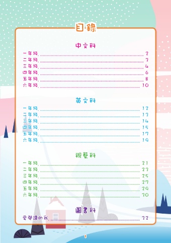 目錄 中文科 一年級 2 二年級 3 三年級 4 四年級 6 五年級 8 六年級 10 英文科 一年級 12 二年級 13 三年級 14 四年級 15 五年級 17 六年級 19 視藝科 一年級 21 二年級 23 三年級 25 四年級 27 五年級 29 六年級 30 圖書科 愛閱讀的我 32 1
