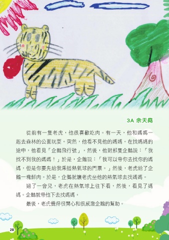 3A 余天堯 從前有一隻老虎,他很喜歡吃肉。有一天,他和媽媽一 起去森林的公園玩耍。突然,他看不見他的媽媽。在找媽媽的 途中,他看見「企鵝飛行號」。然後,他對那隻企鵝說:「我 找不到我的媽媽!」於是,企鵝說:「我可以帶你去找你的媽 媽,但是你要先給我乘搭熱氣球的門票。」然後,老虎給了企 鵝一塊鮮肉。於是,企鵝就讓老虎坐他的熱氣球去找媽媽。 過了一會兒,老虎在熱氣球上往下看,然後,看見了媽 媽。企鵝就帶他下去找媽媽。 最後,老虎覺得很開心和很感激企鵝的幫助。 28