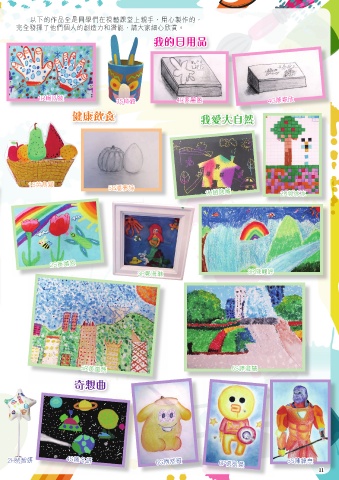 以下的作品全是同學們在視藝課堂上親手、用心製作的, 完全發揮了他們個人的創造力和潛能,請大家細心欣賞。 我的日用品 1R楊以純 4G陳嘉欣 3S林潞 4R麥麗盈 健康飲食 我愛大自然 1S黃雋穎 5G潘夢詩 1H趙逸曦 2R郭冰冰 2S黃靖恩 3P鄭海琳 3R陳幗婷 5R黃嵐雋 5S譚澄慧 奇想曲 2H柴智妍 4S陳冬妍 6G傅然資 6P張凱傑 6S陳緯熹 11
