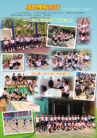 綠色學校旅行 2019年10月8日(星期二) 一年一度的學校綠色旅行,除了讓學生多接觸大自然和加強師生互動外,也鼓勵學生用膠盒盛載食物, 盡量減少購買獨立包裝的食物,並自備餐具,以響應環保。 一、二年級 荔枝角公園(嶺南之風) 三、四年級 曹公潭戶外康樂中心 26