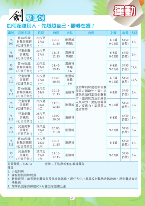 210 訓練班 17/8 20:45 樂趣 9-12歲 (5堂) 12人