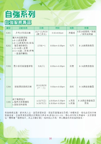 E205 a. 獨木舟證書課程 b.19/7(日) b. 8:00am-6:00pm a.西貢 8-18歲自強會員及