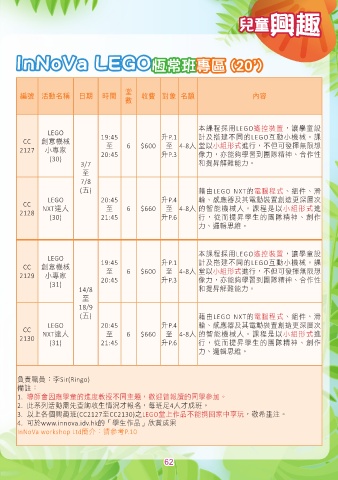 3. 以上各個興趣班(CC2127至CC2130)之LEGO堂上作品不能携回家中享玩,敬希垂注。
